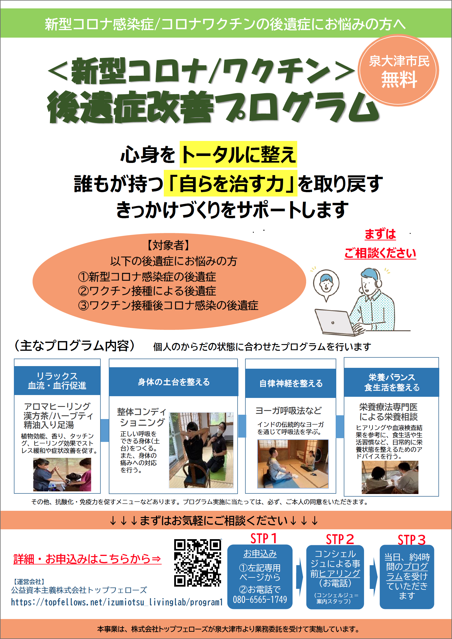 | プログラム | 養生セミナー、泉大津版セルフ健康チェック、養生ステーションなど、様々なプログラムを提供いたします。 | 統合医療の専門医とオンライン相談を実施し、養生、解毒、免疫サポートなど、重症化予防に資するソリューションをご提案します。 | 統合医療の専門医立ち合いの下、ヨガ、整体、高濃度水素吸入など、自己治癒力を高めるためのプログラムを実施し、症状を緩和、改善に導きます。 |
